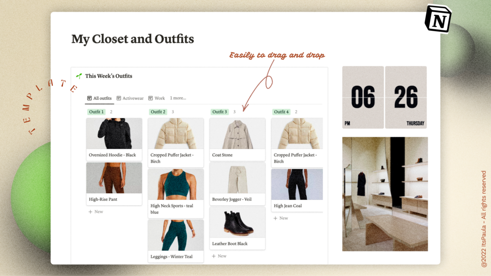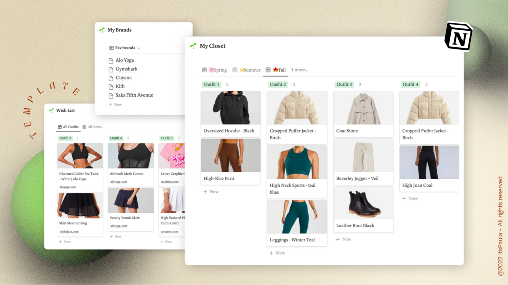 Don't waste any more time deciding on the perfect outfit. Allow this Notion Template to assist you in pre-organizing your outfits with a simple Drag & Drop feature and the ability to save your online wish list items in one place.